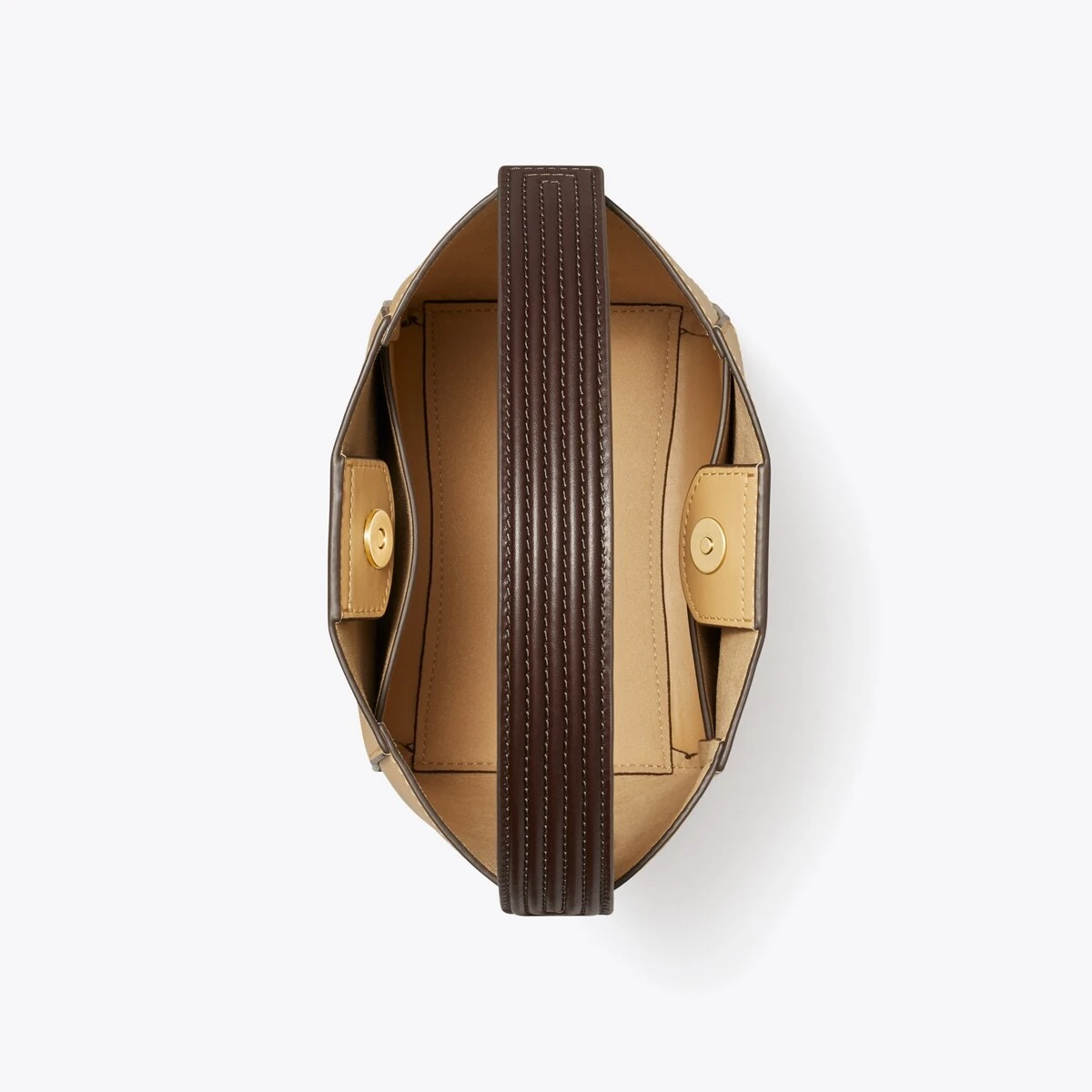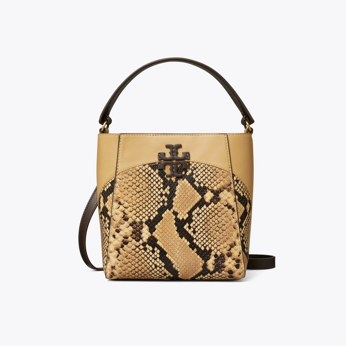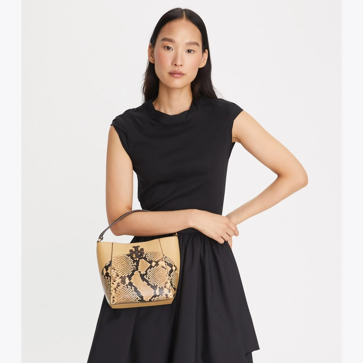 The small McGraw Bucket Bag is crafted in snake-embossed leather, with a die-cut Double T and pick stitching, sewn by hand. Carry it two ways: by the stitched top handle or removable crossbody strap.