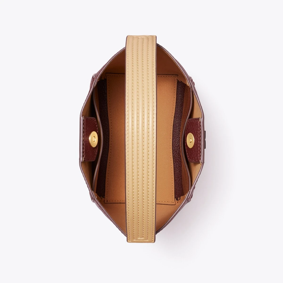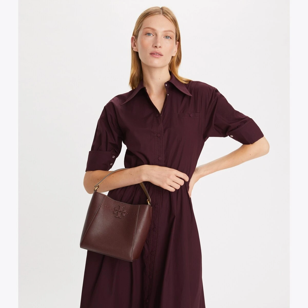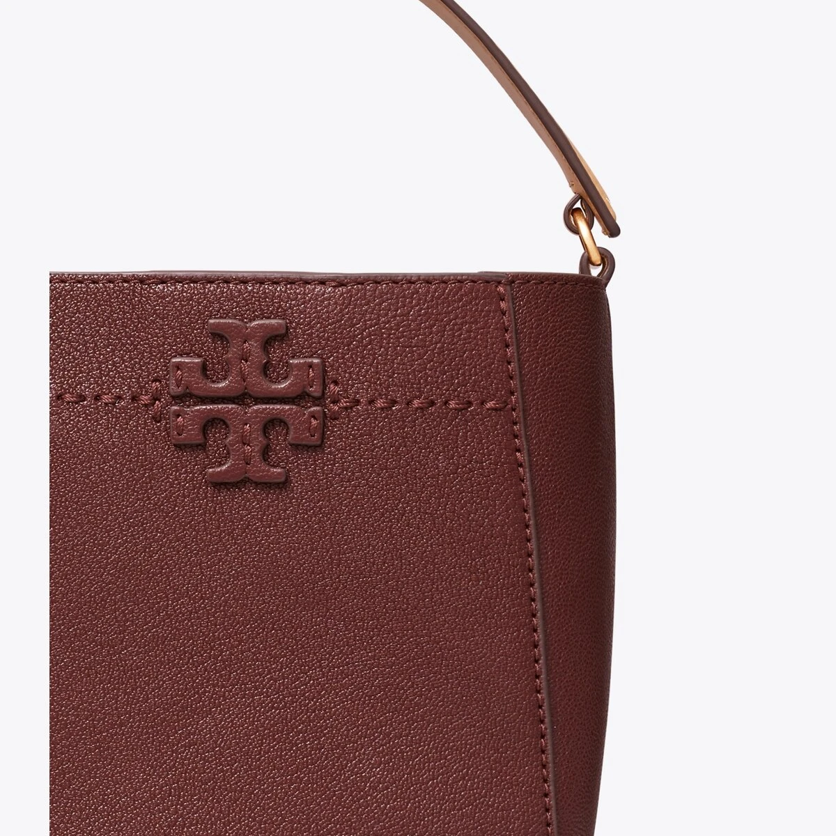 The McGraw Bucket Bag is made of soft textured leather, with a die-cut Double T and pick stitching, sewn by hand. Carry it two ways: by the stitched top handle or removable crossbody strap.