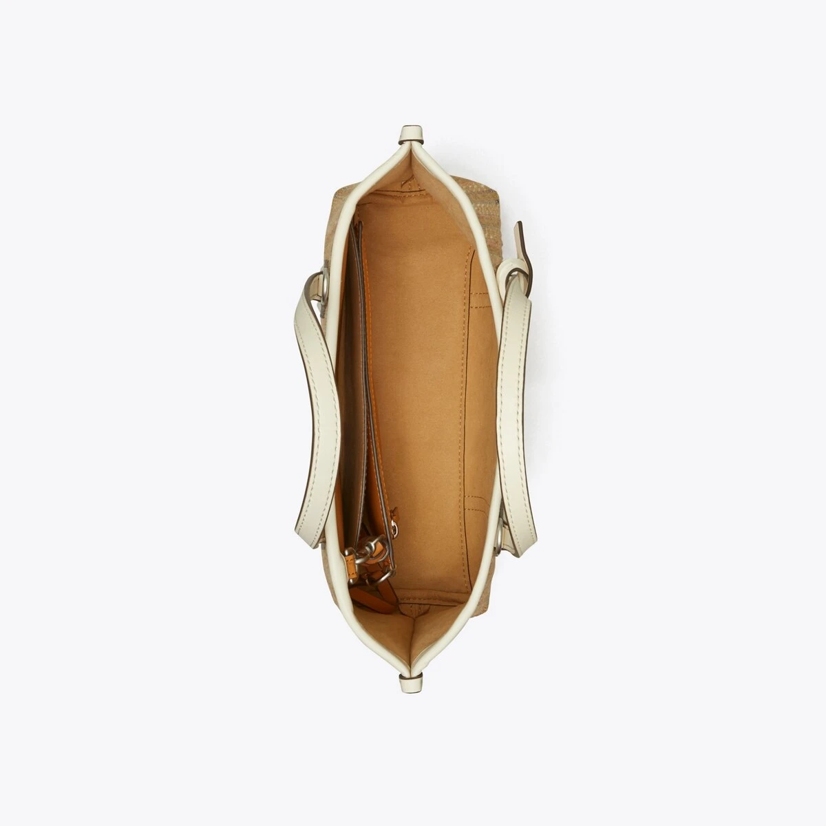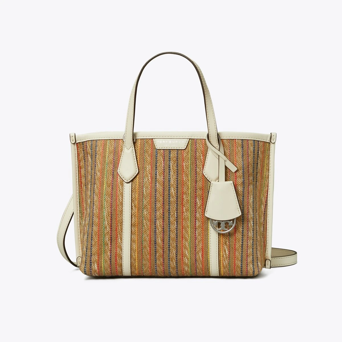 Minimal hardware on a streamlined silhouette. A thoughtful approach to extreme function. Our Small Perry Triple-Compartment Tote is crafted in striped woven raffia with leather trim. It has a center zip pocket, convenient pockets for organization and an optional crossbody strap.