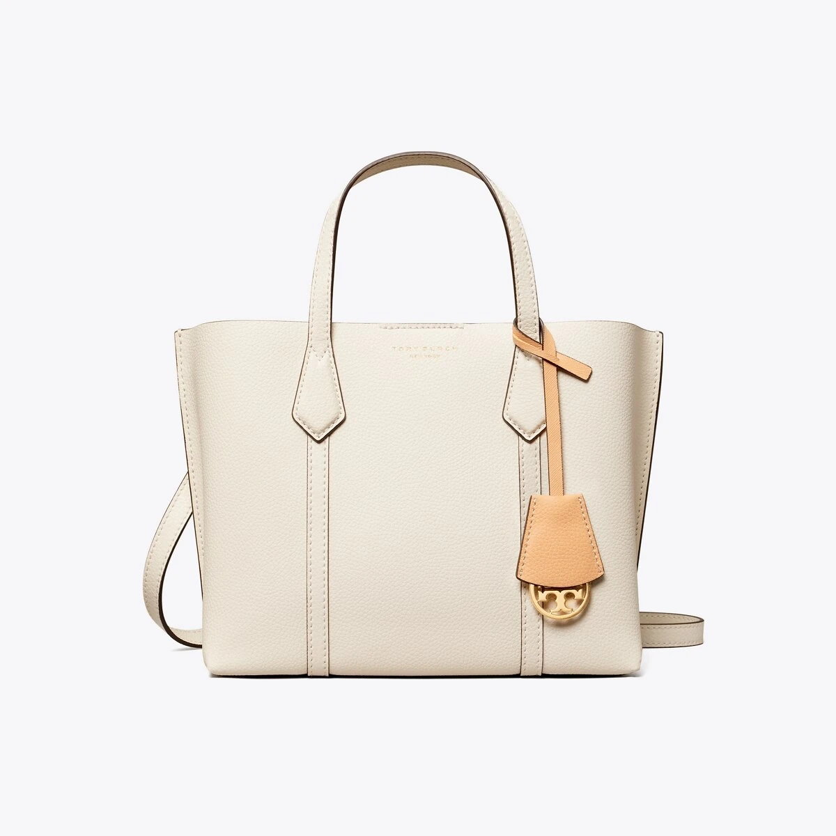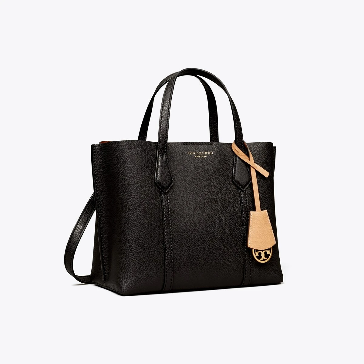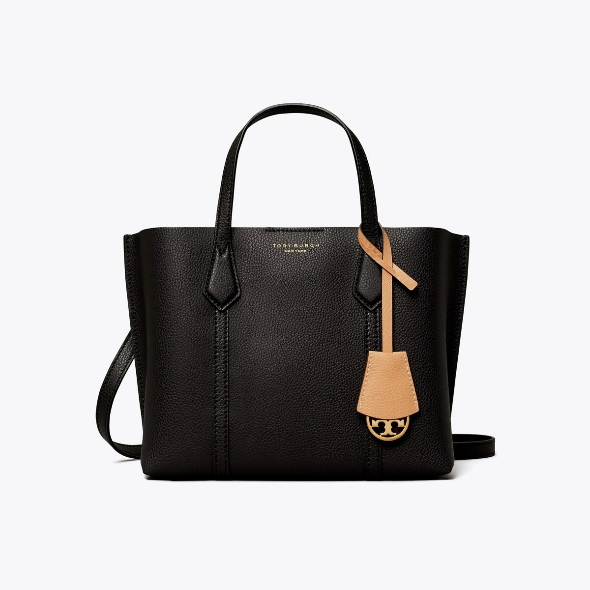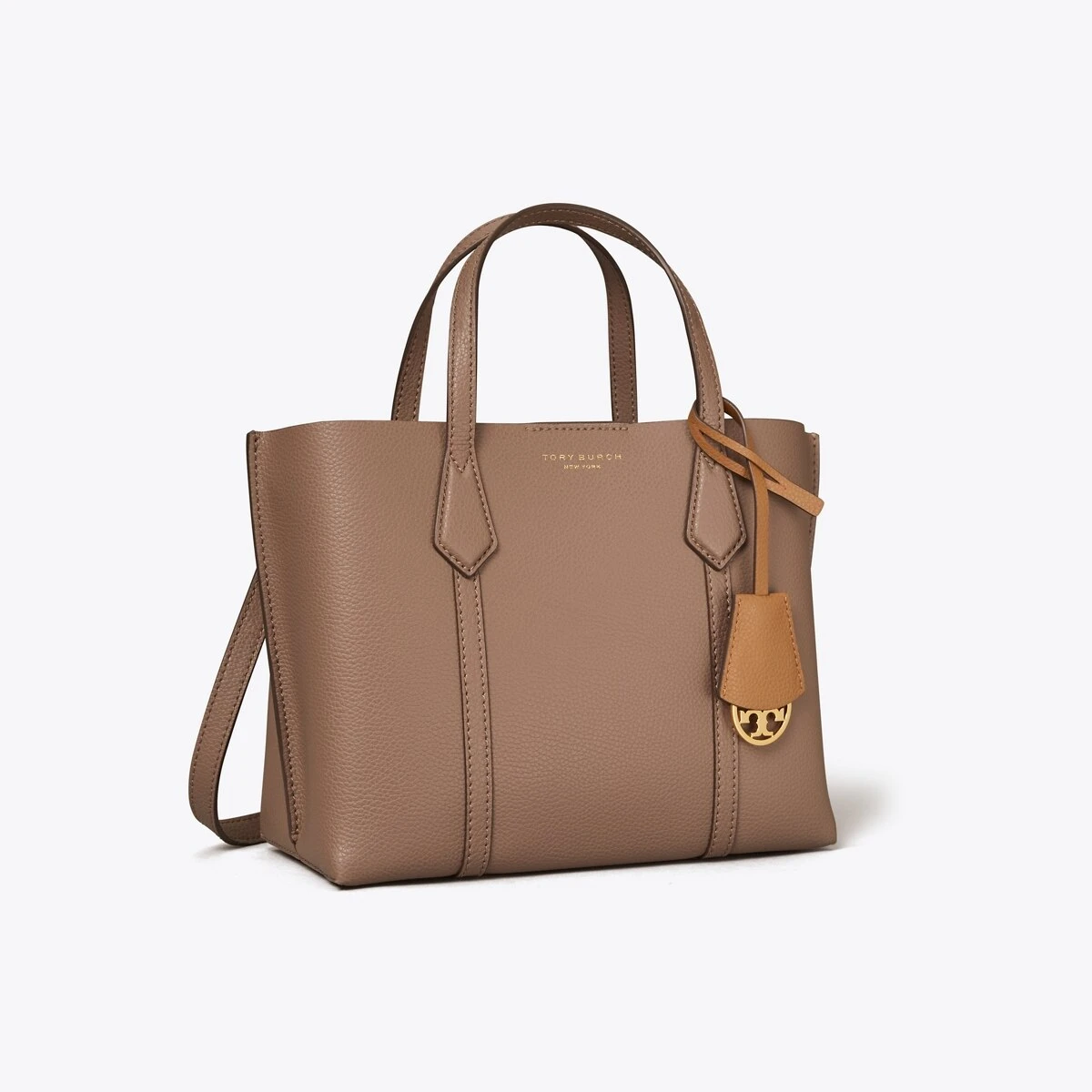 Made for multi-tasking. Our small Perry Triple-Compartment Tote Bag is made of rich Italian pebbled leather that’s bonded inside — making it soft yet structured. Contrast-color details appear throughout: from the interior to the brushed gold charm. It has a center zip pocket and an optional crossbody strap.