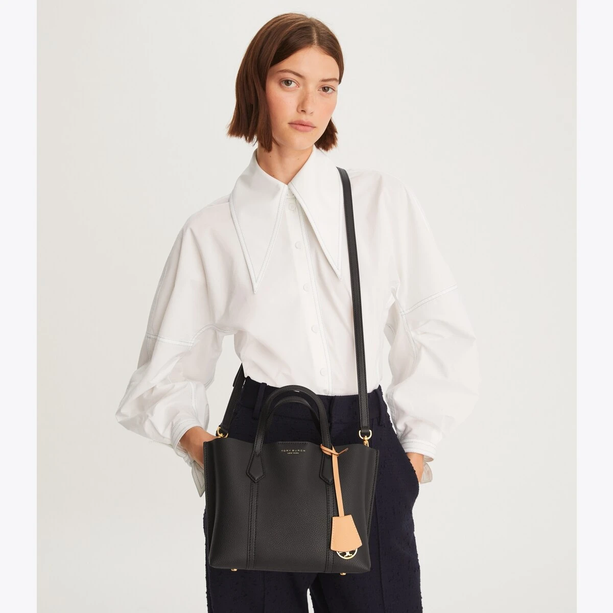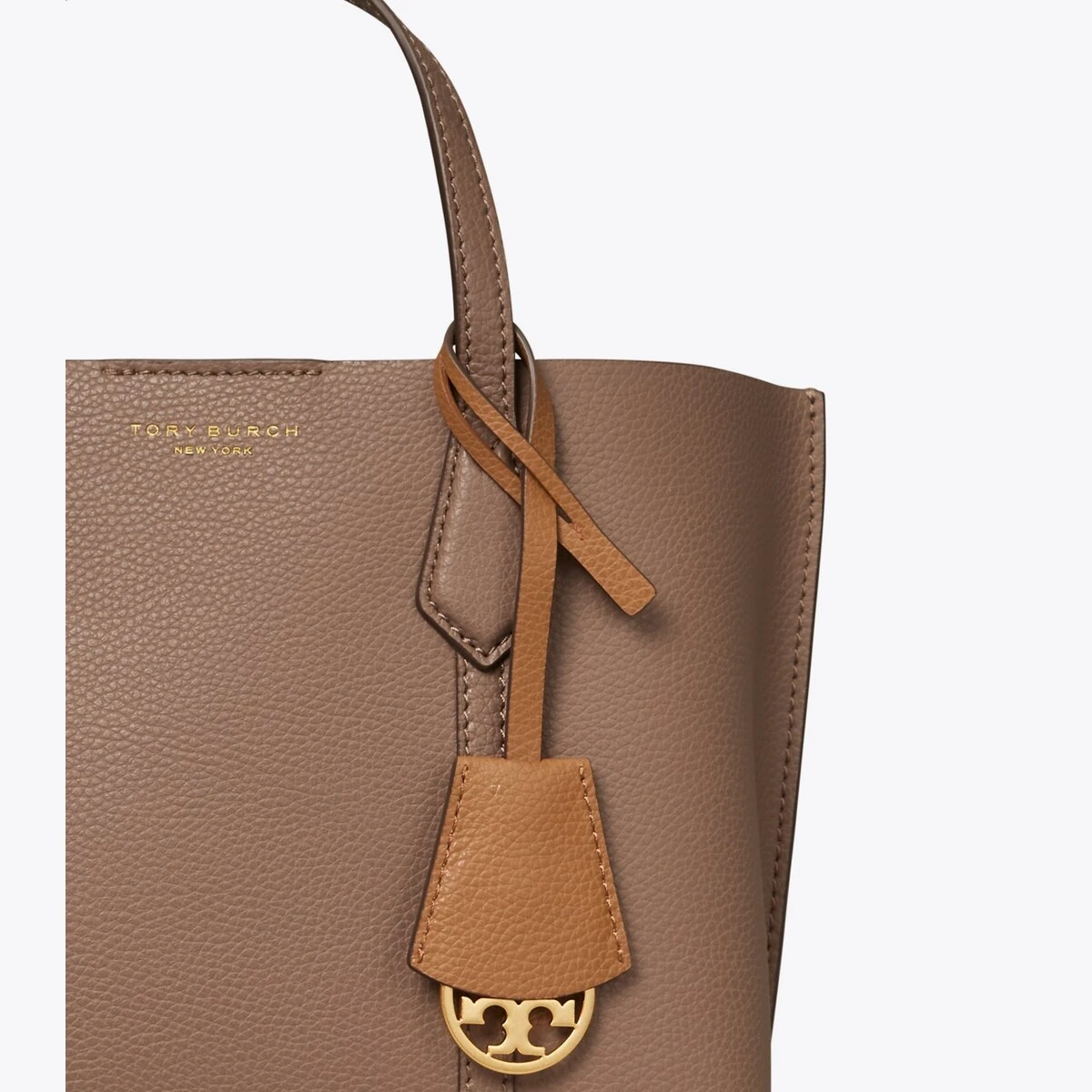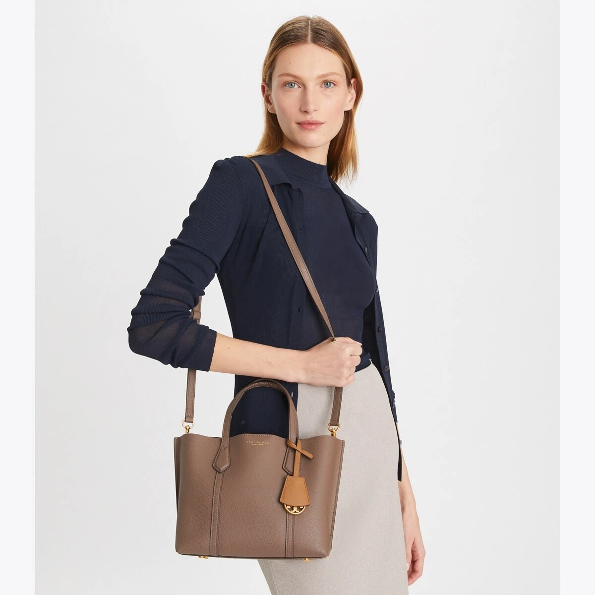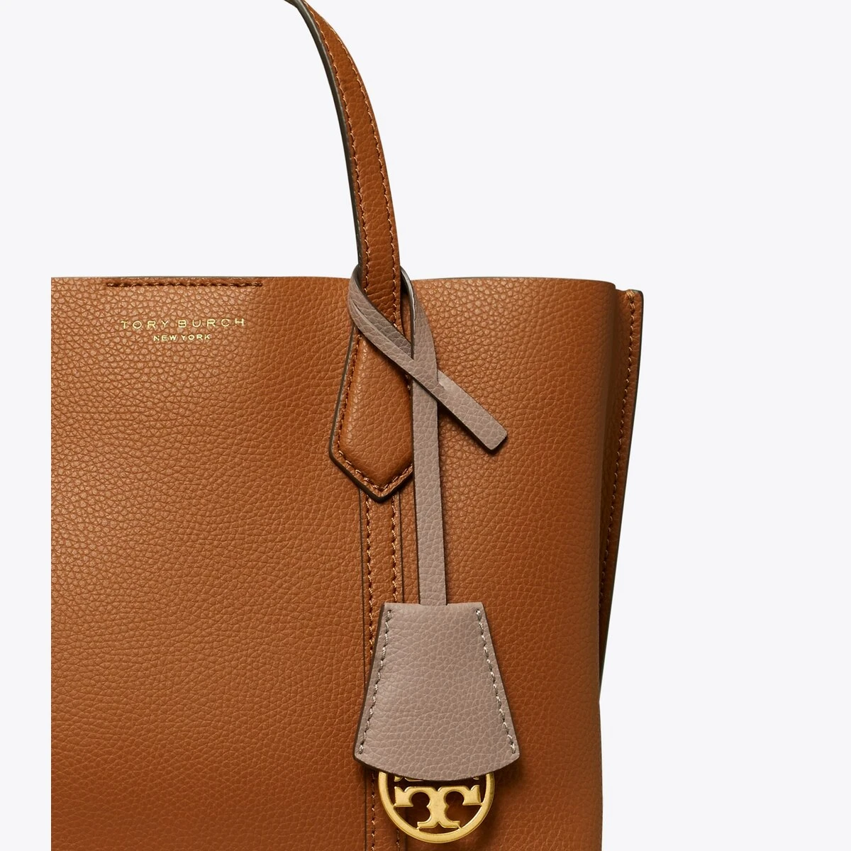Made for multi-tasking. Our small Perry Triple-Compartment Tote Bag is made of rich Italian pebbled leather that’s bonded inside — making it soft yet structured. Contrast-color details appear throughout: from the interior to the brushed gold charm. It has a center zip pocket and an optional crossbody strap.