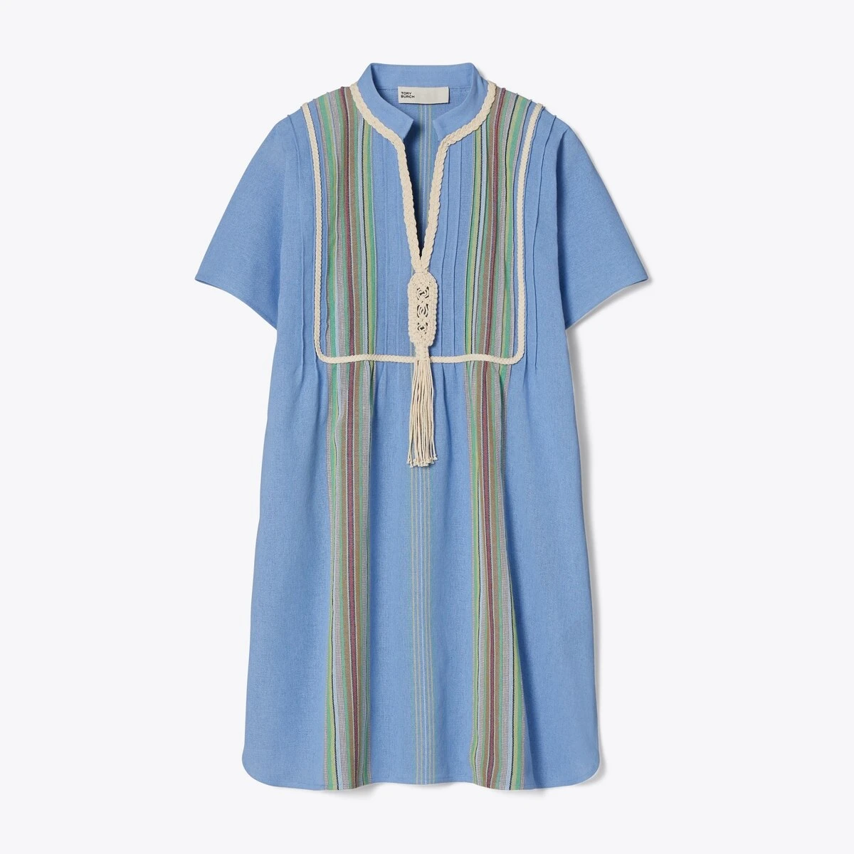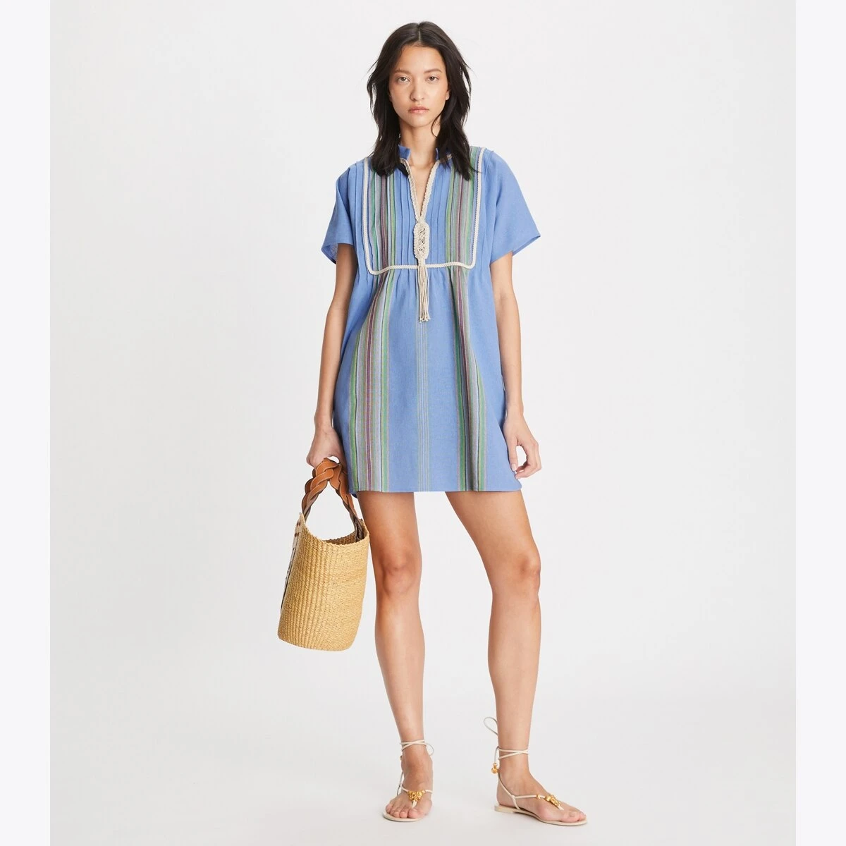 One of our signature silhouettes, inspired by Tory’s travels. The Striped Mini Tunic is made of cotton gauze and finished with macramé trim over a pintuck-pleated bib. Universally flattering in a relaxed cut, it is perfect to wear over a swimsuit at the beach or poolside for drinks.