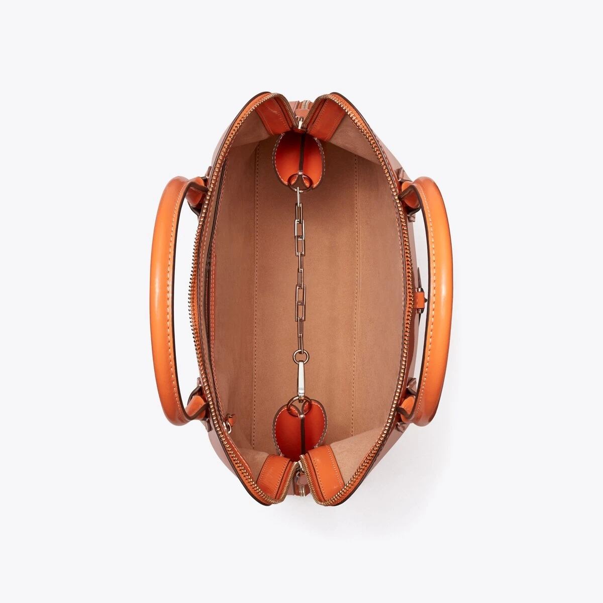 - Zipper closure; interior chain with dog clip