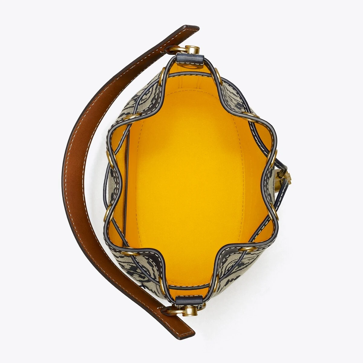 The bucket bag is trimmed in fine leather. When worn crossbody, the top handle falls naturally. Our metal logo cord stopper works as a keeper for the drawstrings. Press and hold the Double T down while guiding the drawstrings through — and release to lock. Lined in soft microsuede, the interior has a pocket for organization, while an exterior sleeve puts small items within reach. Every detail is considered, with special attention to function and versatility.