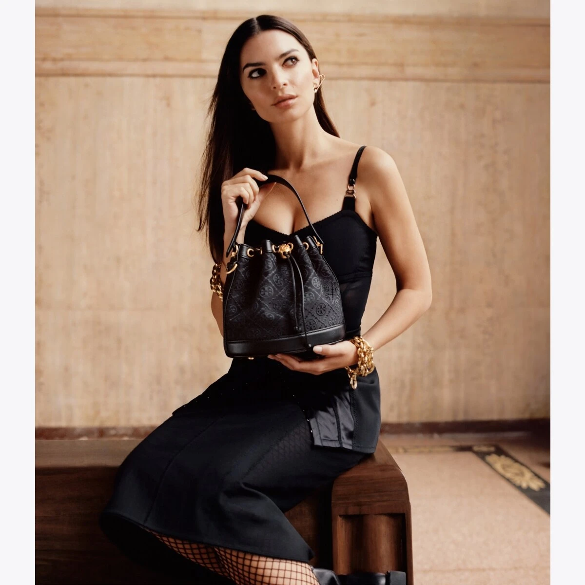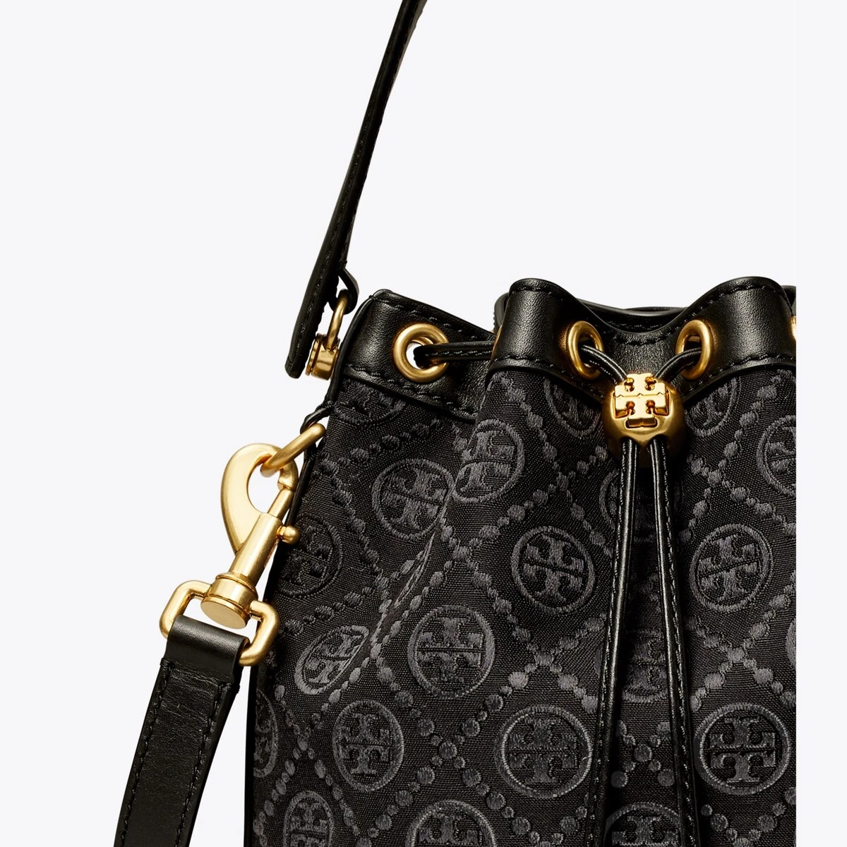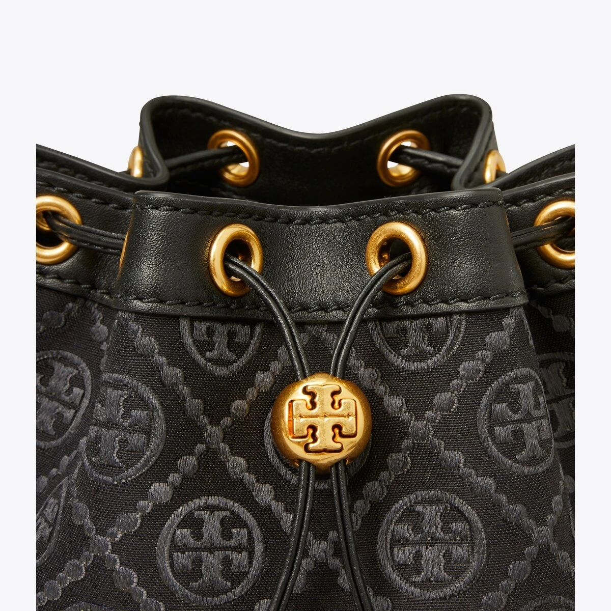 The bucket bag is trimmed in fine leather. When worn crossbody, the top handle falls naturally. Our metal logo cord stopper works as a keeper for the drawstrings — press and hold down the Double T while guiding the drawstrings through, and release to lock. Lined in soft microsuede, the interior has a pocket for organization, while an exterior sleeve puts small items within reach. Every detail is considered, with special attention to function and versatility.