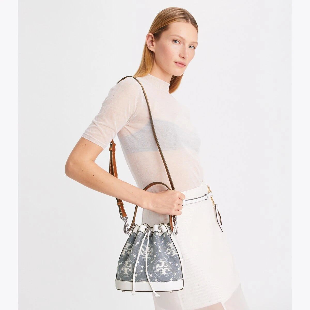 The bucket bag is trimmed in fine leather. When worn crossbody, the top handle falls naturally. Our metal logo cord stopper works as a keeper for the drawstrings. Press and hold the Double T down while guiding the drawstrings through — and release to lock. Lined in soft microsuede, the interior has a pocket for organization, while an exterior sleeve puts small items within reach. Every detail is considered, with special attention to function and versatility.