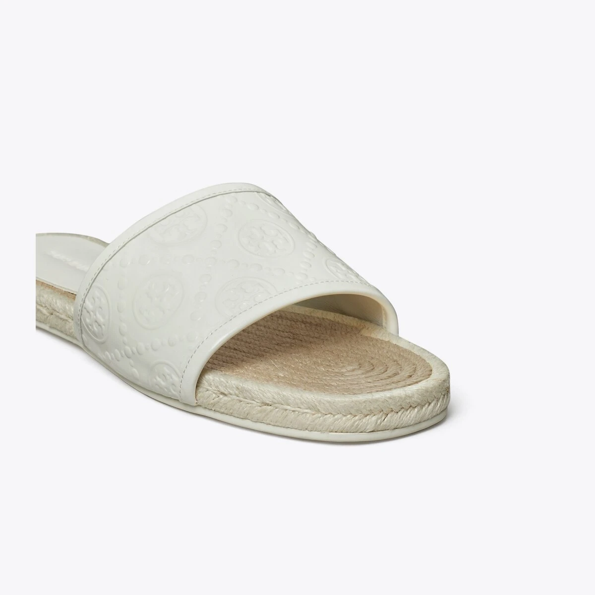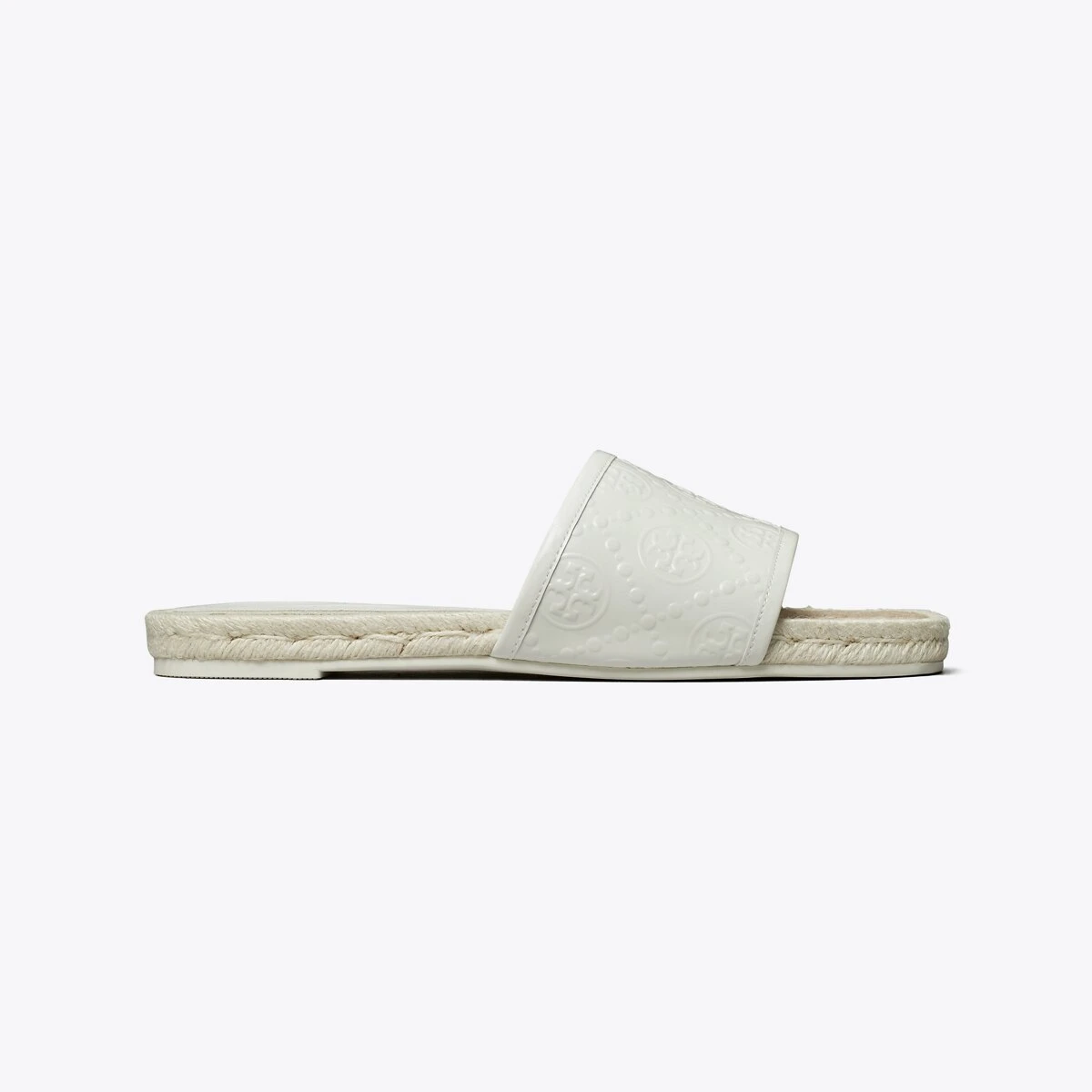 Meticulously crafted in embossed patent leather, the espadrille slide is trimmed in fine leather, with a jute sole stitched by hand.