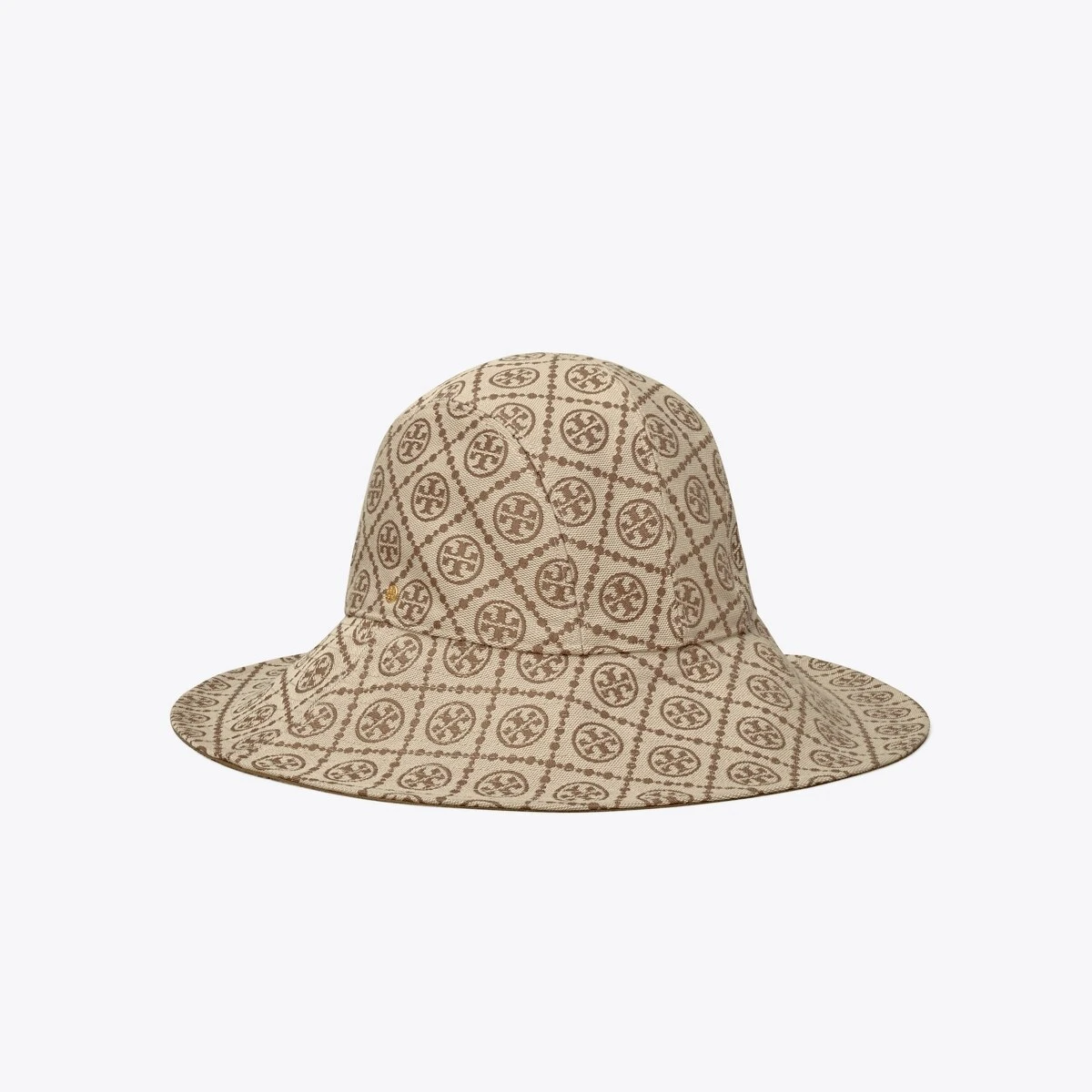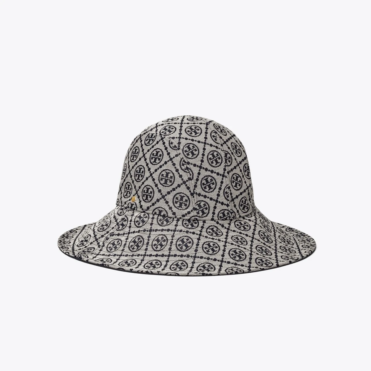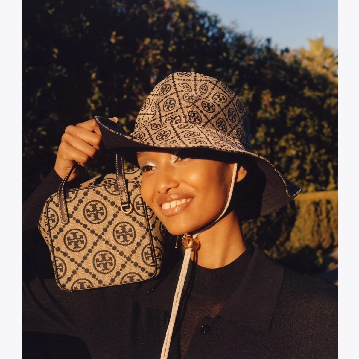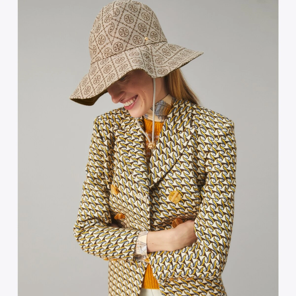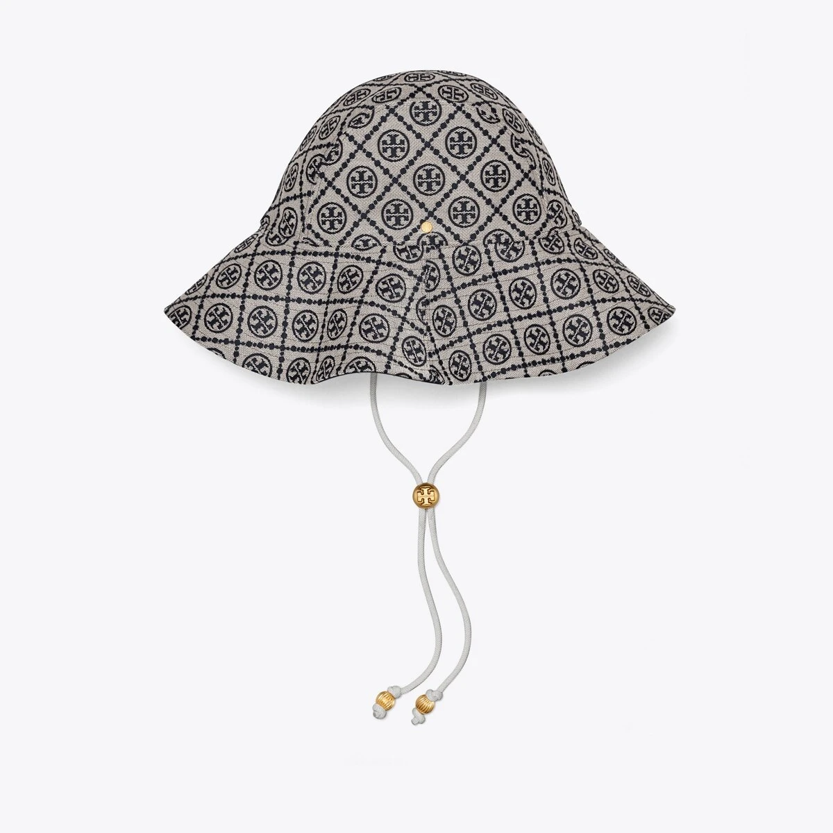 The bucket hat is patterned on one side and solid on the other. Its drawstring cord adjusts with a brass Double T toggle, finished with filigree beads. The top-stitched brim is structured and can be styled turned up or down. Every detail is considered, with special attention to function and versatility.
