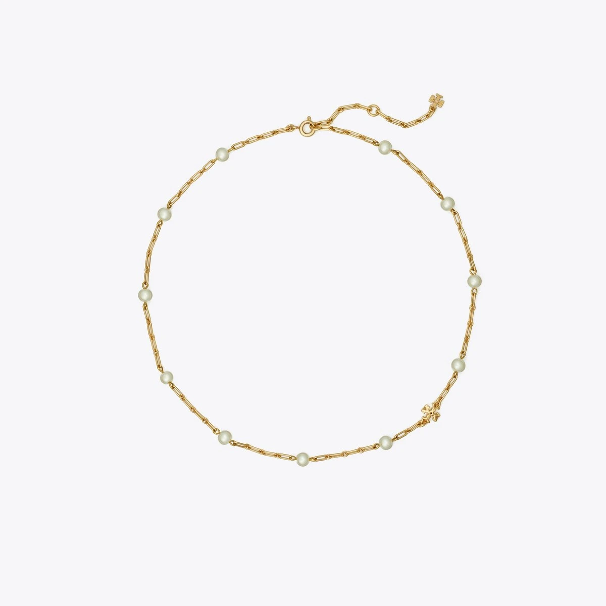 Essential chains through the Tory lens. The Thin Roxanne Chain Necklace is designed in a subtly distinctive contrast of textures: delicate links, glass pearls and molten Double Ts. Create a personal signature when you wear it solo or stacked, minimal or maximal.