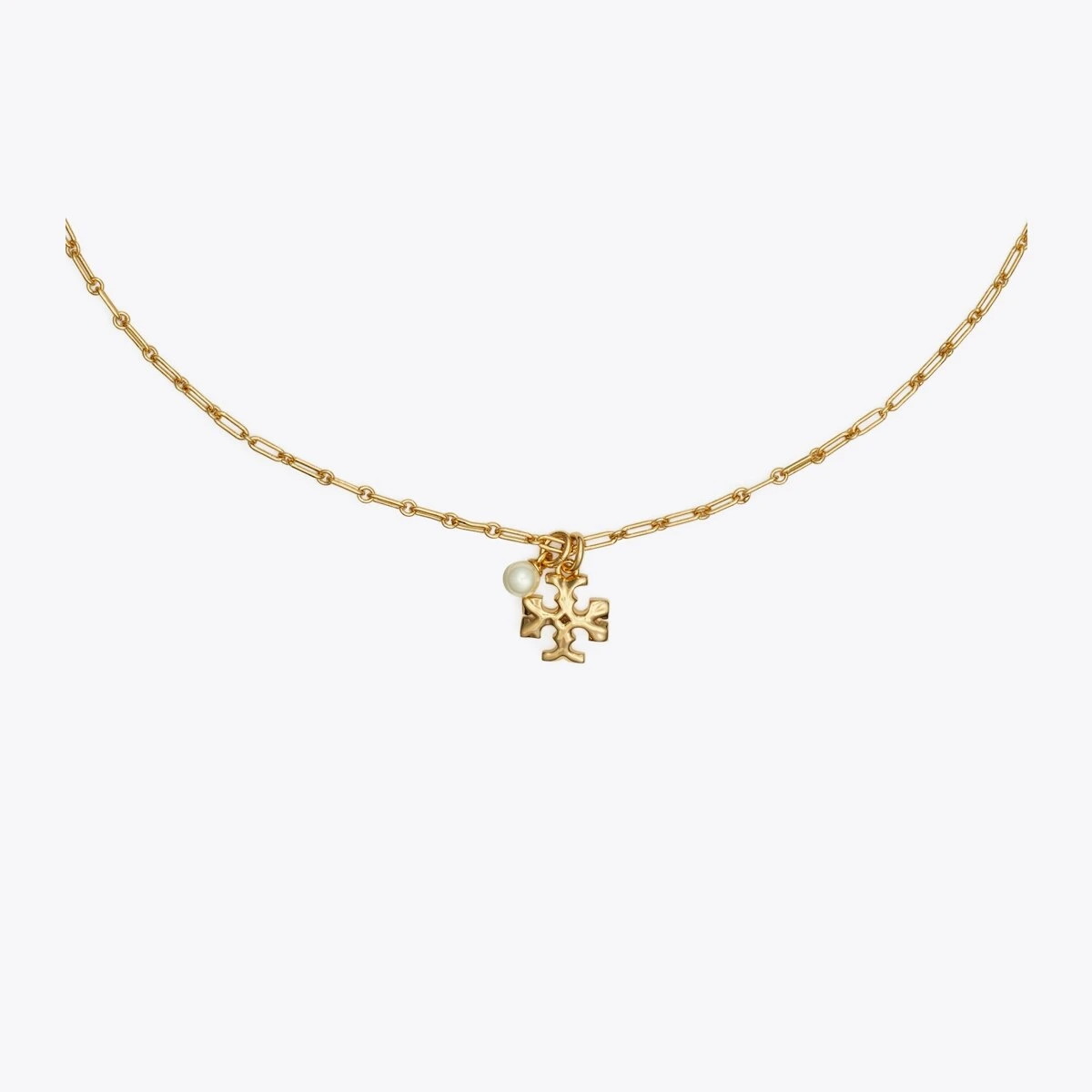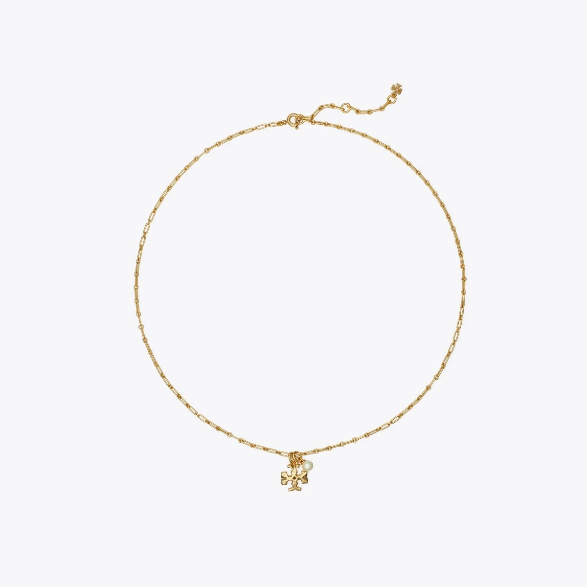 Essential chains through the Tory lens. The Thin Roxanne Pendant Necklace is designed with delicate links accented with a glass pearl and molten Double T. Create a personal signature when you wear it solo or stacked, minimal or maximal.